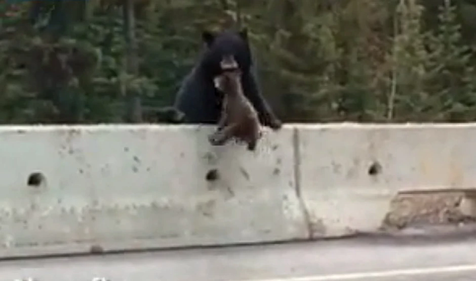 Nestašno meče američkog crnog medveda uspelo je da preskoči betonsku prepreku i opasno se približilo gustom saobraćaju na ivici auto-puta. Vozila prolaze kraj njega, a ono ne ume da se vrati.
