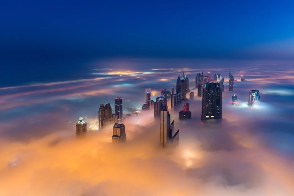 Najviše zgrade na svetu se probijaju kroz magleni prekrivač, Dubai od koga zastaje dah. Ova pojava se dešava samo dvaput godišnje, u rano jutro zbog naglog zagrevanja vazduha i visoke vlažnosti. Spektakularan pogled sa najviše zgrade na svetu Burdž Kalife, visoke 828 metara otkriva grad iznad guste magle koja dostiže visinu i do 400 metara.