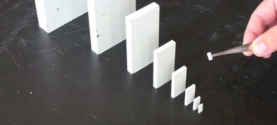 Tu se vidi da jedna domina, koja je veličine zrna pasulja, uspeva da sruši dominu na kraju, koja ima preko 50 kila.