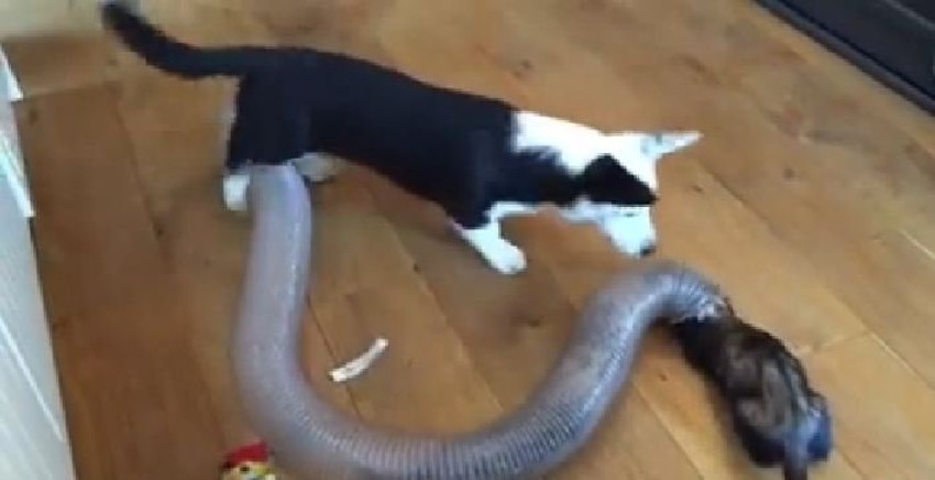 Preslatki korgi je zbunjen prvo izgledom ovih njemu nepoznatih stvorenja, a onda i njihovim provlačenjem kroz cev na podu, koju su njegovi vlasnici postavili znajući da će feretkama biti posebno zanimljiva.