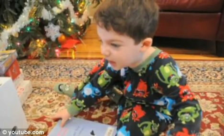 Na snimku, koji je na internet anonimno postavio dečakov otac, vidi se kako se mali dečak u pidžamici praktično zakopao u gomilu poklona ispod jelke i kako uzbuđeno skida omot sa zagonetnog poklona, u kom se ispostavlja da su tri knjige.