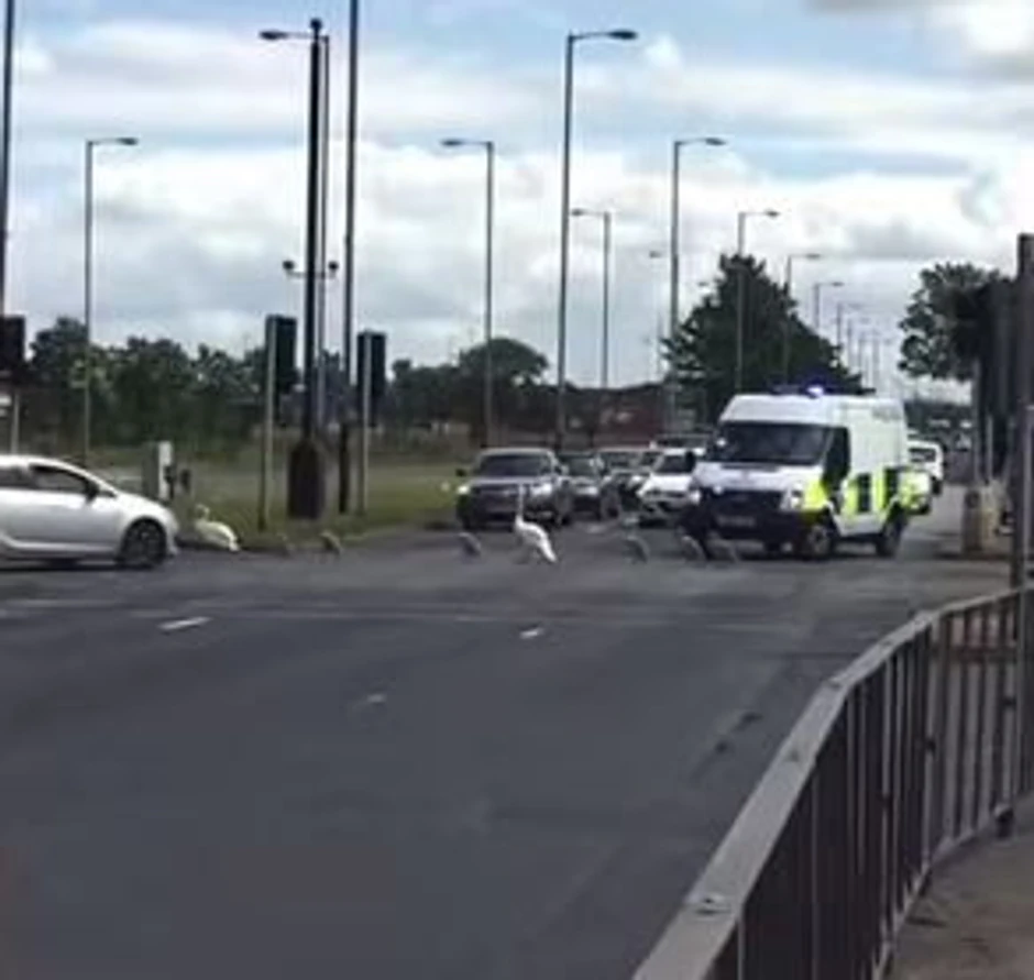 Porodica labudova je imala oformljeno gnezdo u blizini ovog puta u Liverpulu i prelaskom istog želeli su samo da se vrate svojoj kući.
