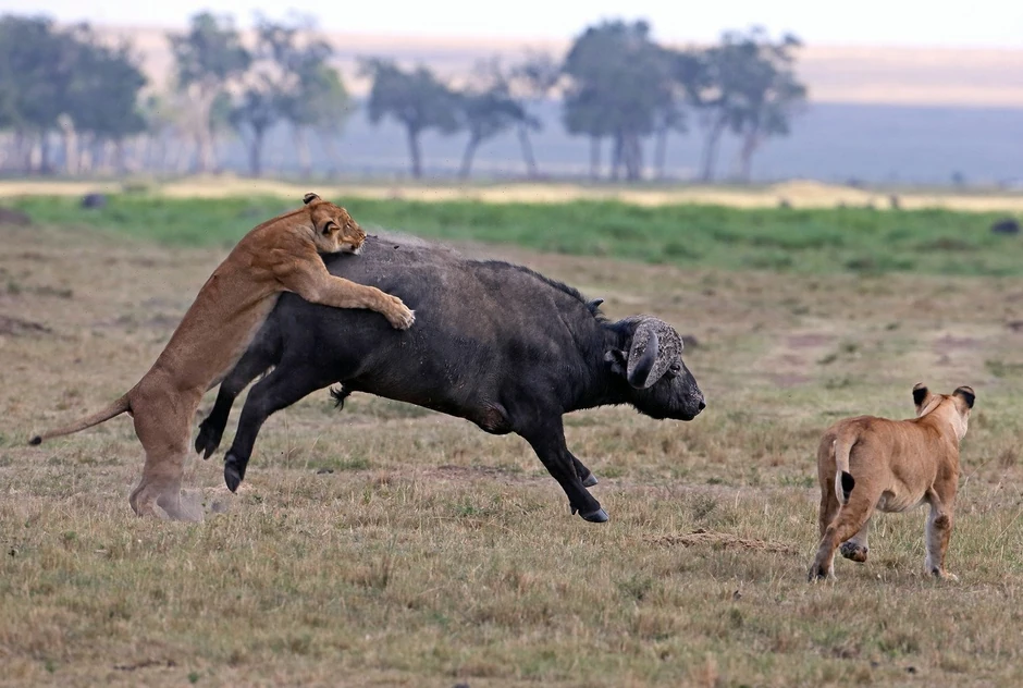 Opkolile su ga sa svih strana, a jedna od njih je otišla toliko daleko da je čak kandžama ščepala bivola za leđa. Bez milosti je skočila na njega kako bi ga oborila.