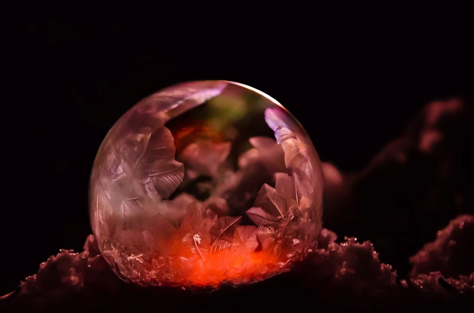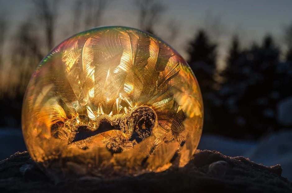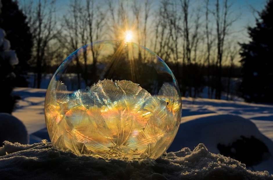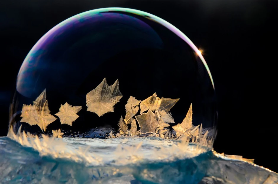 Kako su se baloni od sapunice ledili, u njima su se formirali ledeni kristali različitog oblika.