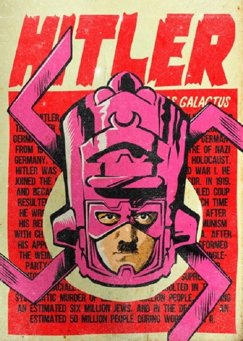 Da Luz: Galaktus je kosmička zemlja iz Marvelovih stripova, poznata kao ‘Proždrljivac svetova’. Hitler je hteo da stvori novi poredak u Evropi, ali uveren sam da bi pokušao da napravi i novi svetski poredak da ga nisu zaustavili. Sa svom tom propagandnom mašinerijom, harizmatičnim govorima i oružanim snagama, on je jedini diktator koji je zaista mogao da ‘pojede svet’. Uza sve to, bio mi je potreban neko ko će biti dobro prepoznatljiv ispod šlema Galaktusa. Zanimljivo je da možete da ga prepoznate samo na osnovu očiju i brkova. Galaktusov šlem je zahvaljujući maloj izmeni pretvoren u kukasti krst.”