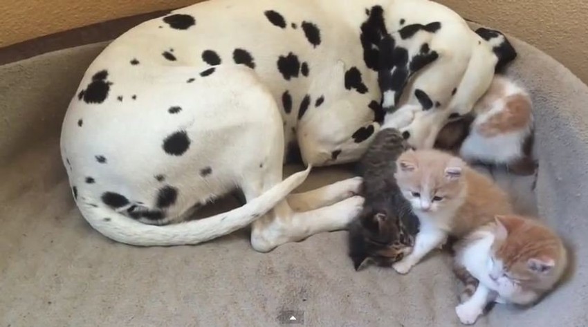 Jedna ženka dalmatinca usvojila je mačiće koje je njena vlasnica donela u kuću da bi videla kako će ih ona prihvatiti.