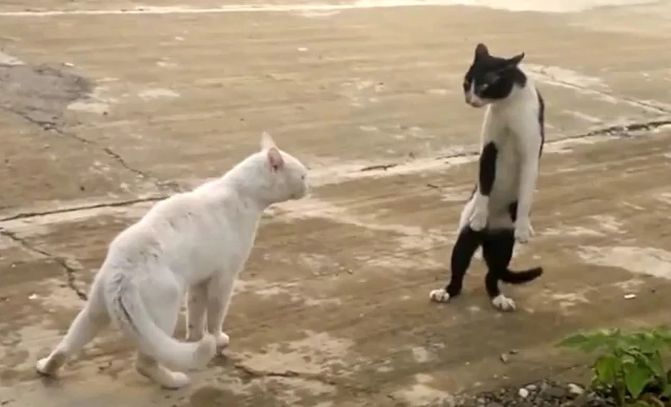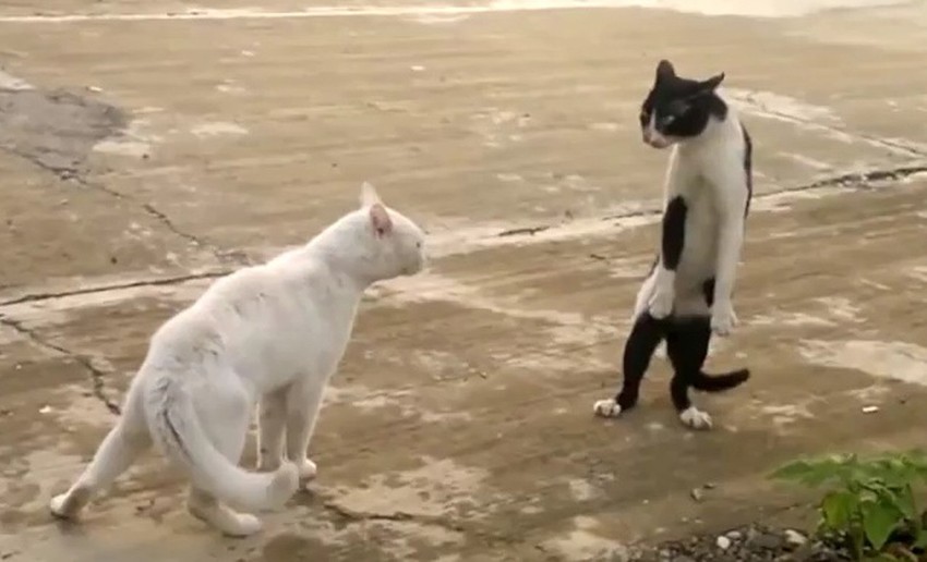 Tokom prvih nekoliko sekundi obe životinje su stajale u mestu proučavajući jedna drugu, a zatim je beli mačor odlučio da pređe u napad.