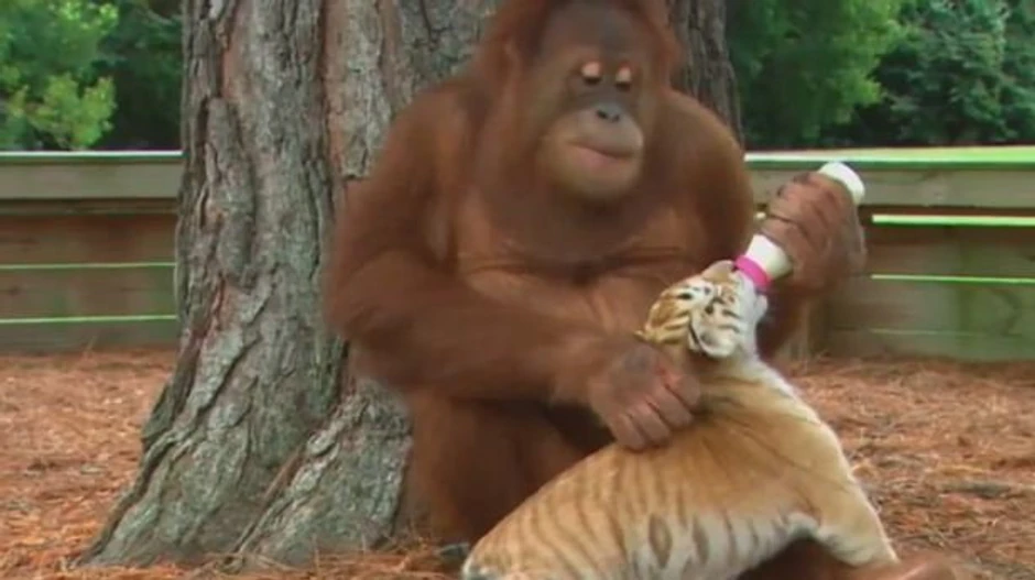 To je bio slučaj i sa ženkom orangutana koja je u jednom zoološkom vrtu prihvatila male tigrove, mazila ih i igrala se sa njima.