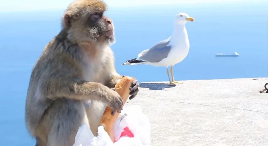 Sudeći po onome što ćete videti na ovom snimku, majmuni ne pridaju mnogo značaja Darvinovoj teoriji i ne mare za to što je čovek njihov inteligentniji srodnik. Ovaj majmun sa Gibraltara je bio gladan i potražio je hranu u torbi jednog turiste.