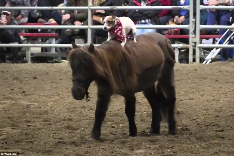 Poni uvek dopušta psu da skoči na njega, a pas zaista uživa u jahanju.