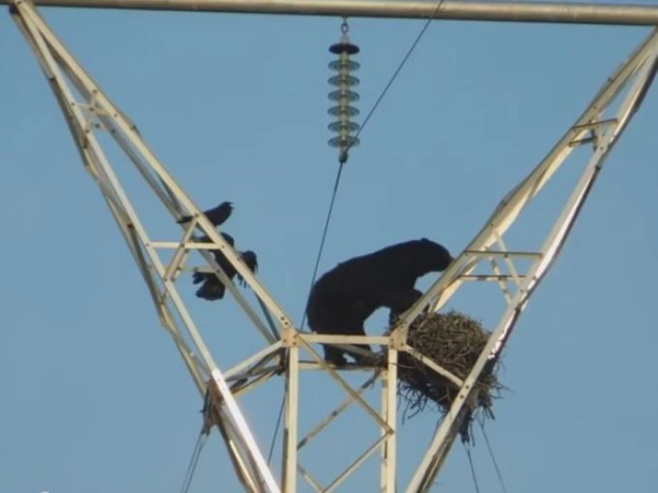 Grupa lovaca iz Alberte u Kanadi ugledala je medveda na vrhu dalekovoda tokom napada na gnezdo gavranova.