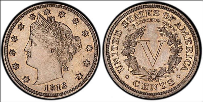 Pet novčića od pet centi izrađeno je krajem 1912. godine u Filadelfiji, ali je radnik u kovnici Semjuel Braun na njih stavio godinu 1913, kada se ta vrsta novčića više nije proizvodila.