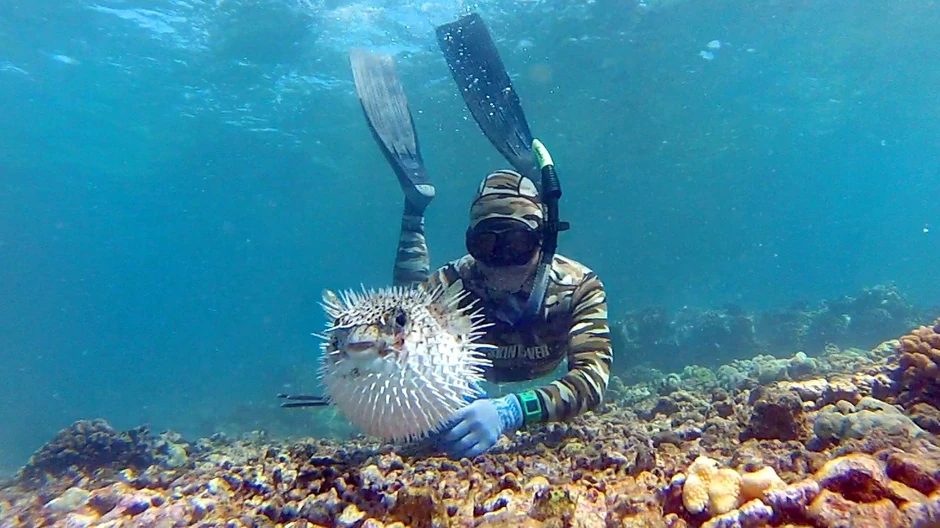 Riba se uplašila od ronioca i pokrenula svoj odbrambeni sistem - nadula telo i izbacila bodlje.
