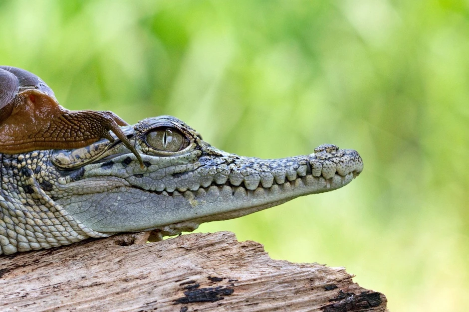 Mali krokodil je bio potpuno miran i ako da mu uopšte nije smetao puž koji se kretao po njegovoj glavi i ustima.