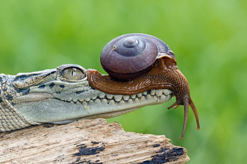 Na sreću puža, krokodil nije razjapio čeljust, već je strpljivo sačekao da puž produži dalje.