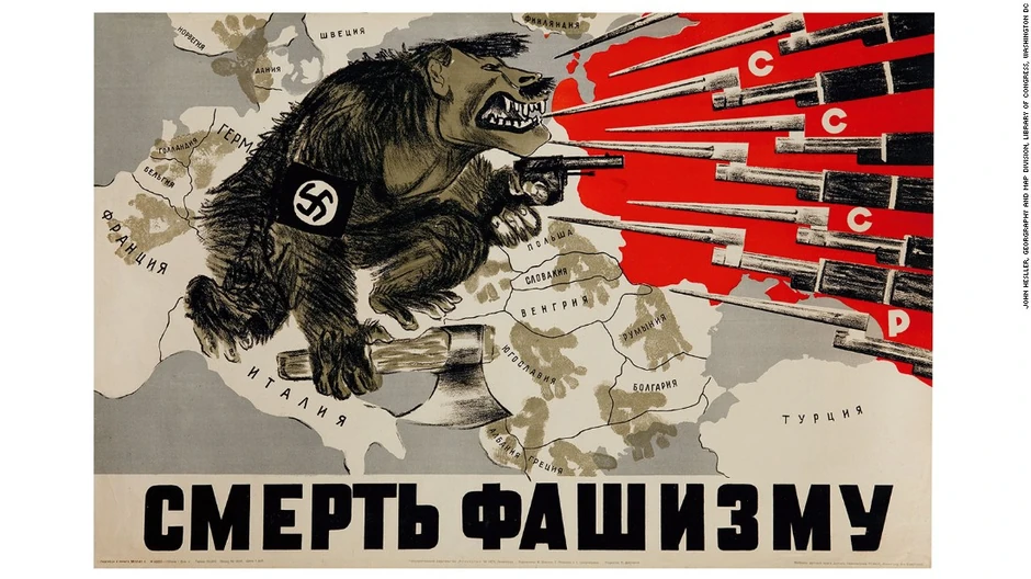 Ova mapa je jako simbolična, jer sadrži kukasti krst i simbole SSSR, pa je svima jasno o čemu se radi. Ona prikazuje ogromnog Hitlera u obliku brkate gorile sa jedne strane i dobro naoružane snage SSSR sa druge. Nastala je u propagandne svrhe, nedugo nakon što je Nemačka 1941. prekršila sporazum o miru sa Rusijom.