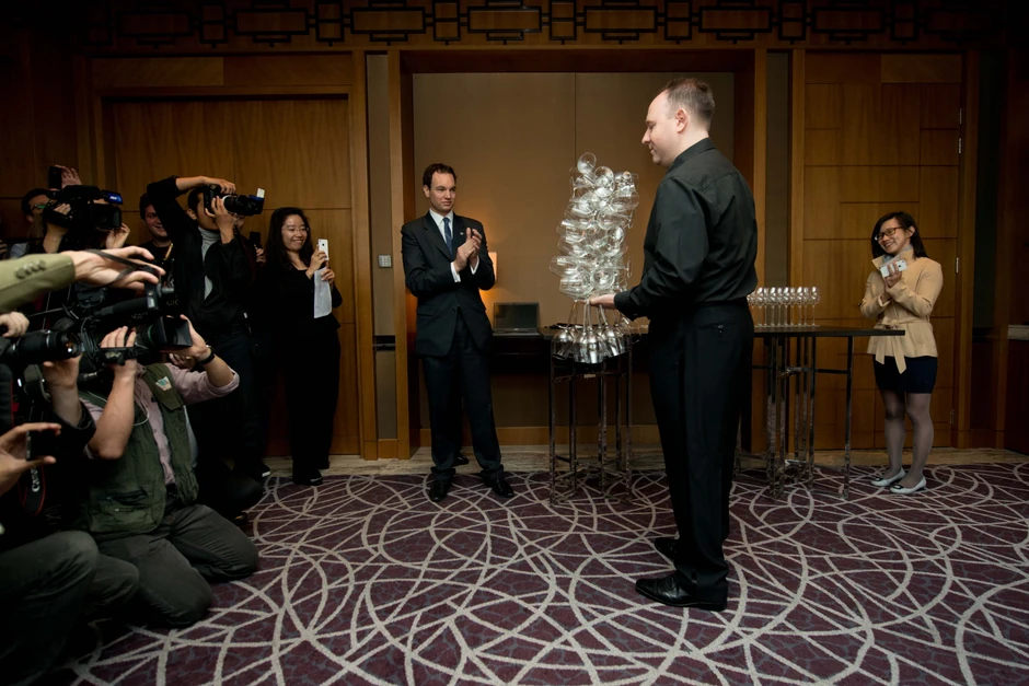 Jedan britanski poznavalac vina oborio je danas svetski rekord u držanju više vinskih čaša u jednoj ruci, pošto je sa 51 naslaganom čašom nadmašio raniji rekord od 39, saopštili su organizatori.