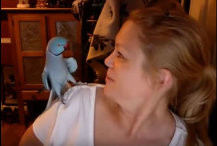 Plavi papagaj se udobno smestio na rame vlasnice i jednostavno obožava da se igra žmurke.