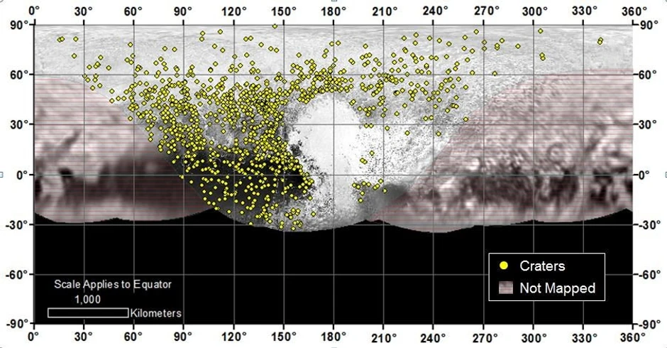 U cilju utvrđivanja starosti pojedinih regiona, tim je brojao kratere na površini. Njihov veći broj signalizira stariji region. Pluton na svojoj površini ima više od 1.000 kratera što ukazuje na to da pojedine regije datiraju od samog nastanka planeta pre oko četiri milijarde godina.