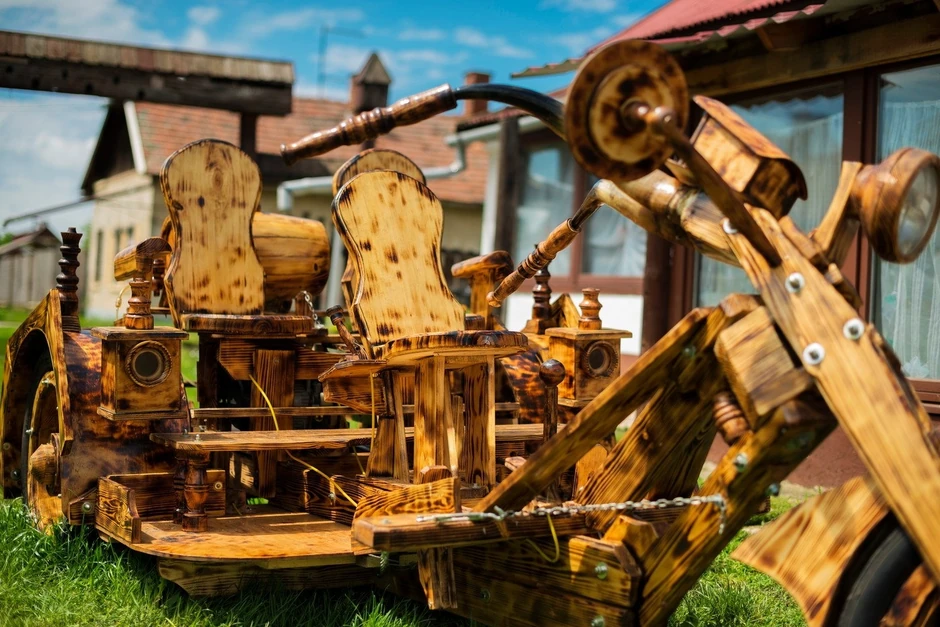 Ova ljuta mašina može da poveze tri putnika, i napravljena je od borovine, dok su drške rogovi mađarskog "sivog" bika.