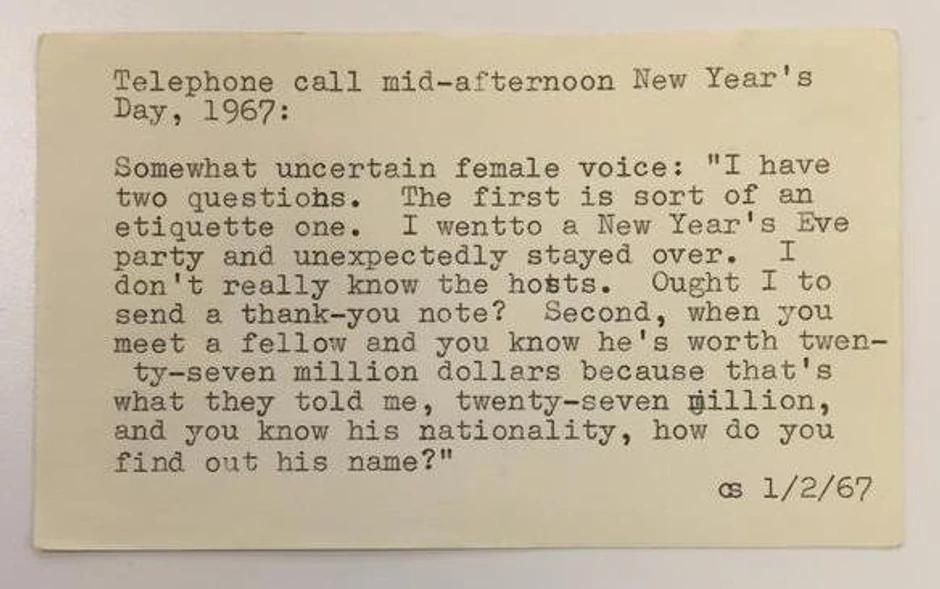 5. Da li treba da pošaljem kartu sa izrazima zahvalnosti što sam posle dočeka Nove godine prespavala kod domaćina? (1967)