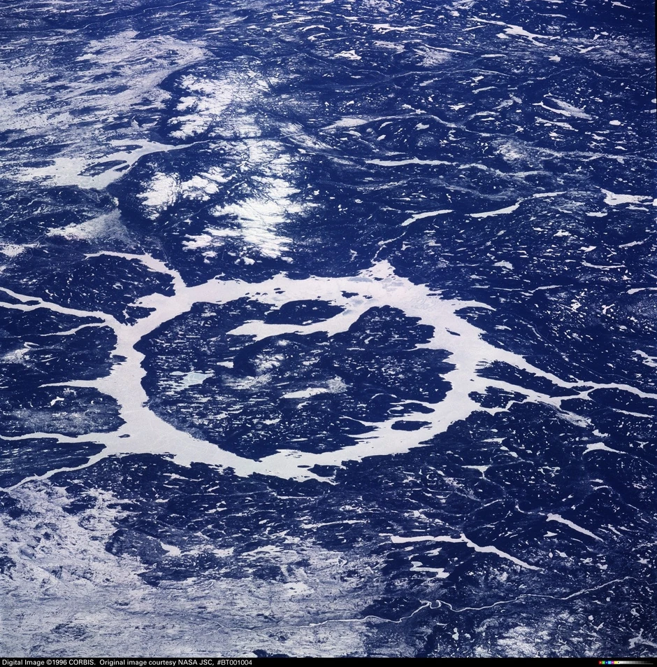Jezero Manikugan, u Kanadi. Jedino pozanto jezero koje ima prstenast oblik, nastalo je pre 200 miliona godina, od udara asteroida prečnika 5km - petog po veličini koji je ikada udario u Zemlju. Ostrvo u jezeru ima veću površinu od vode.