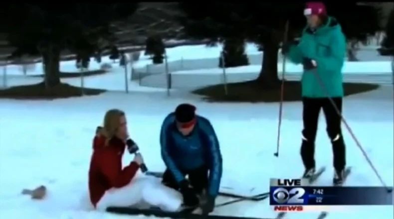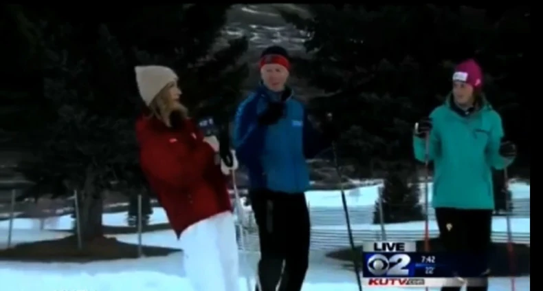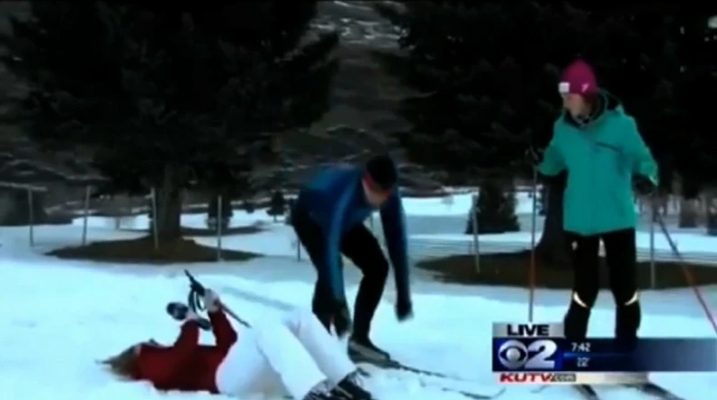 Reporterka iz Jute Bruk Grejhem se usred živog prenosa sa ski staze onesvestila, ali se nakon samo par trenutaka osvestila, i kao pravi profesionalac, nastavila svoje izveštavanje kao da se ništa nije dogodilo.