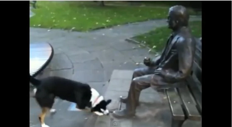 Iako je statua na klupi potpuno nepokretna, pas uporno pokušava da započne igru sa njom.