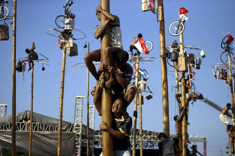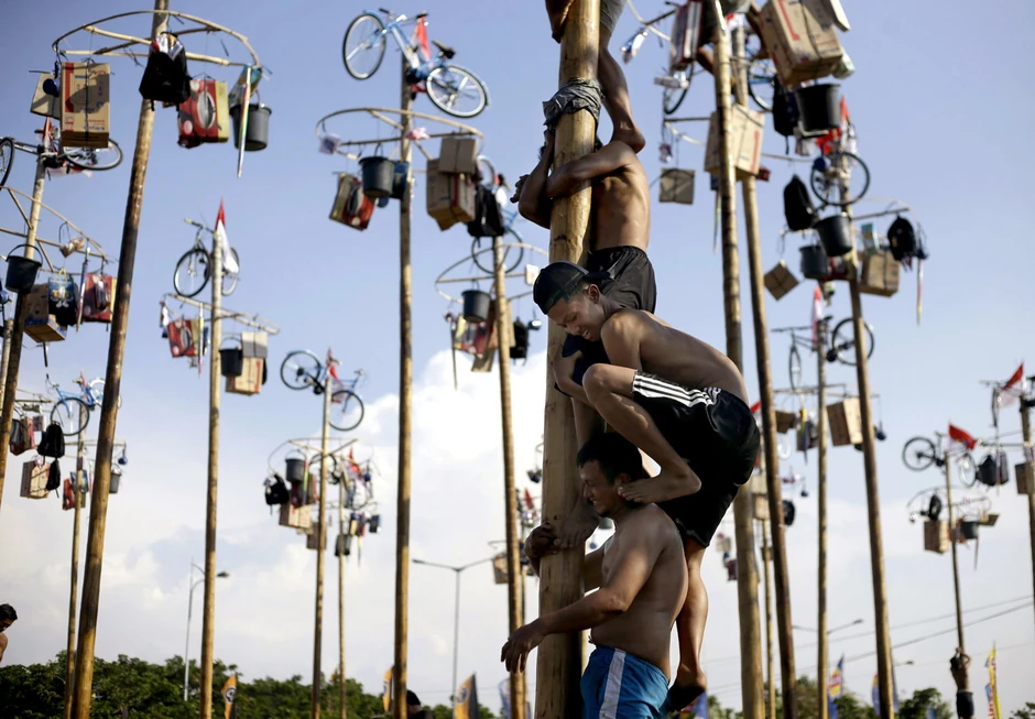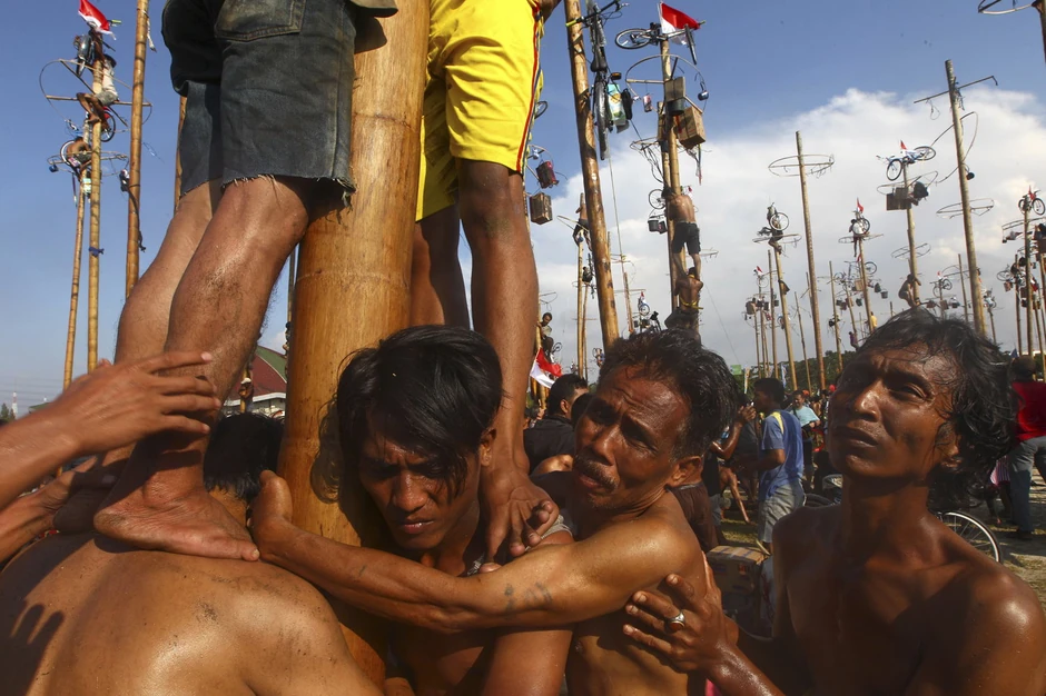U okviru rituala Pandžat pinang, koji se u Indoneziji odigrava 17. aprila povodom obeležavanja dana sticanja nezavisnosti od Holandije 1945. godine, stotine žitelja ove zemlje veralo se uz visoke stubove obavijene slojem gline i masti, ne bi li se dočepali nekog od darova na njihovom vrhu.