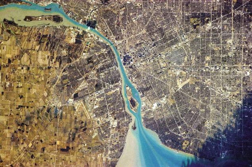 Kanadski grad Vindzor u pokrajini Ontario , Detroit u Mičigenu i reka Detroit koja protiče između njih.