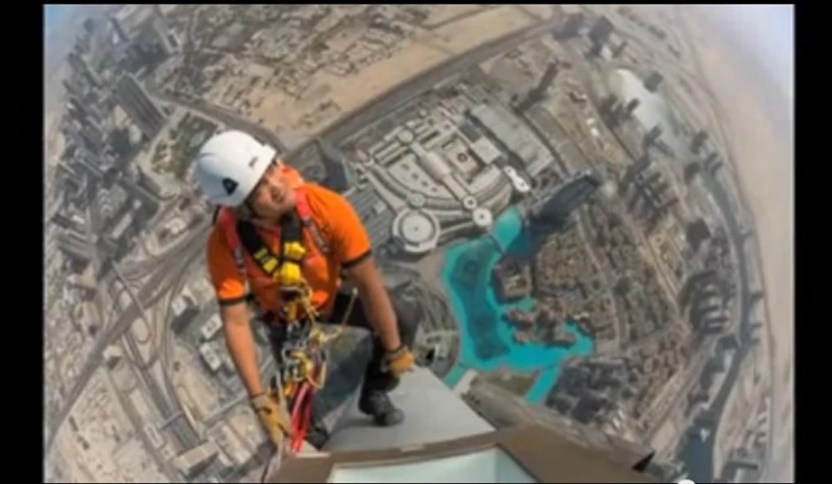 Tu su mu radnici pomogli da se „okači” o šipku i visi sa strane Burdž Kalife pomoću zaštitnih konopaca.