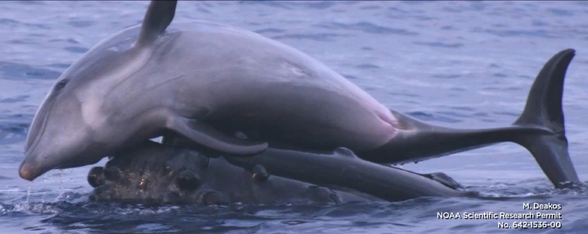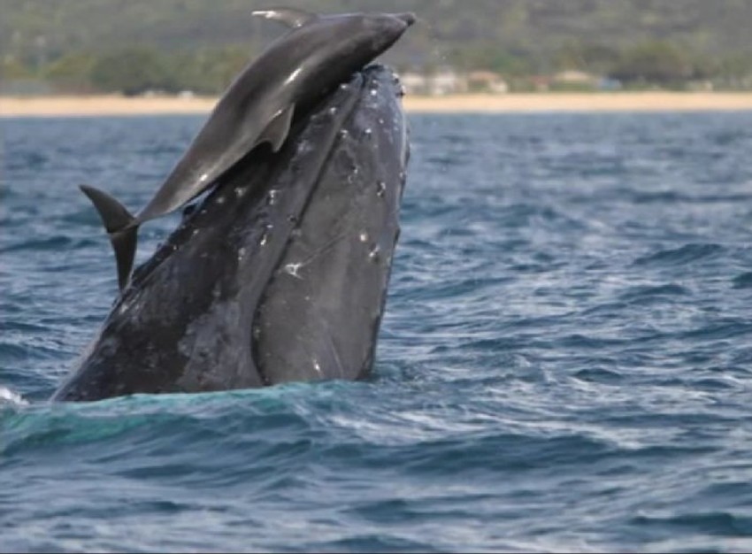 U jednom trenutku kit podiže delfina iznad površine vode, da bi zatim delfin ponovo skliznuo u more. Biolozi su u nekoliko prilika snimili fotografije ove dve životinjske vrste kako se zabavljaju u moru, što je ponašanje koje je veoma retko i ukazuje na to da nisu samo ljudi sposobni da se vezuju za druge životinjske vrste.