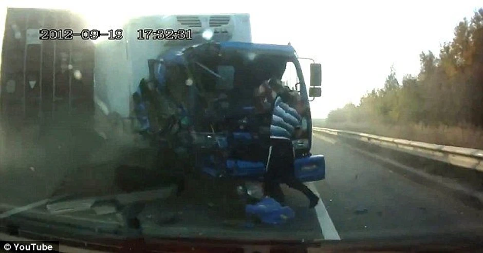 Kamera na instrument-tabli, sve popularniji deo dodatne opreme automobila u Rusiji, zabeležila je zapanjujući trenutak kada je ruski kamiondžija prilikom sudara s drugim kamionom naglavačke proleteo kroz vetrobran i ostao nepovređen.