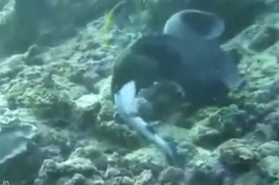 Iznenada se njenom meniju našla mala ajkula za koju se ispostavilo da je bila preveliki zalogaj. Jegulja je uspeda da proguta tri četvrtine ajkule ali je na kraju bila primorana da je ispljune.