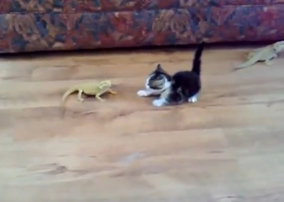 U smešnom video snimku, koji je postao hit na Jutjubu, vidi se malo mače koje znatiželjno ispituje dva velika guštera dok oni hladnokrvno leškare. Međutim kada je jedan od guštera sa leđa prišao mačetu, ono se tolko isprepadalo da je počelo bespomoćno da se bacaka u vazduh.