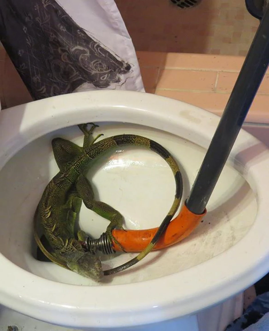 Nakon što nije uspela sama da odčepi wc šolju, pozvala je vodoinstalatera koji je otkrio kako je problem prouzrokovala iguana koja se zaglavila u cevi.