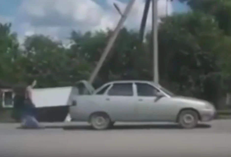 Na snimku iz Kazahstana koji je zapalio internet, žena trči iza automobila i pridržava frižider da ne ispadne iz gepeka automobila dok ga vozi njen dečko.