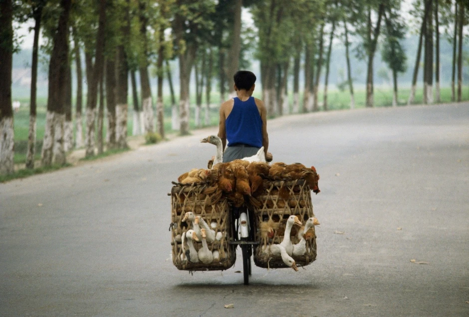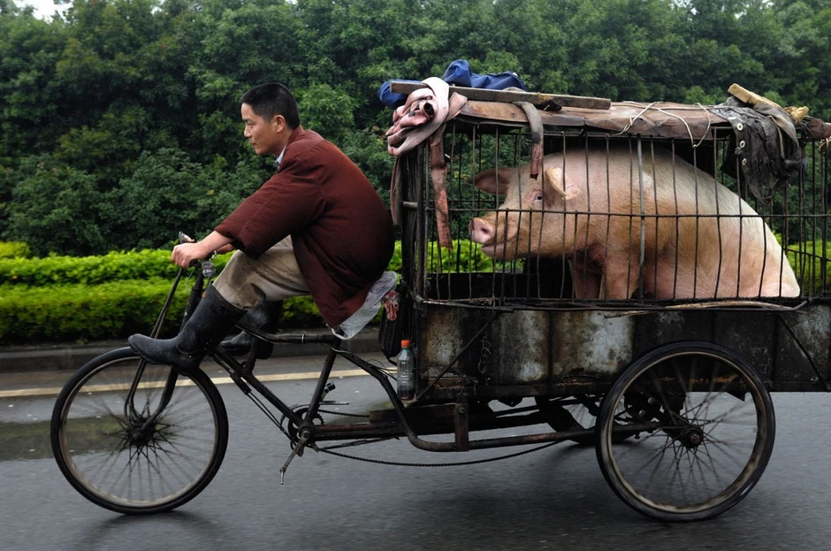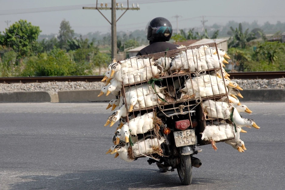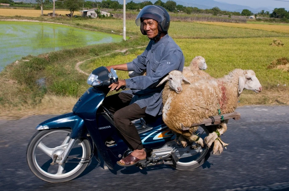 U Aziji i Africi su ovakvi prizori nešto sasvim uobičajeno: Guske i patke u korpama na biciklima, ovce na motorima, slonovi u kamionetima. Ovi ljudi se snalaze na razne načine da transportuju životinje i ne misle na njihovu udobnost.