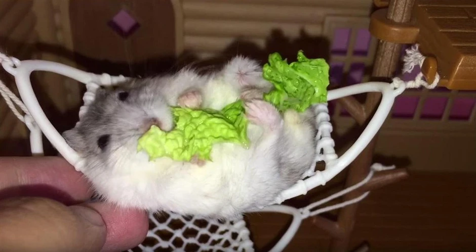 Preslatki hrčci Enoki i Bunapi zaista znaju kako da uživaju. Izvaljeni u svojim visećim mrežama oni su se potpuno usredsedili na ukus hrane koju grickaju.
