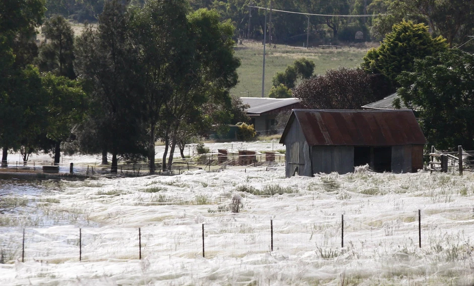 U Australiji su pauci bilo toliko "vredni" da su zelena polja prekrili paučinom toliko, da se trava čak ni ne nazire a pejzaž izgleda potpuno sablasno.