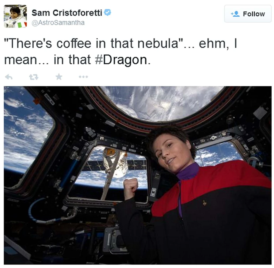 Na fotografiji, Samanta prstom pokazuje na letelicu "SpaceX Dragon", koja je napravljena da bi dopremala namirnice u Međunarodnu svemirsku stanicu. Kako je napisala u tvitu, vrlo je uzbuđena jer im u stanicu stiže aparat za espreso.