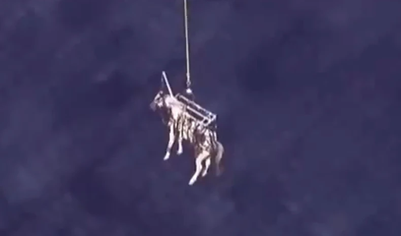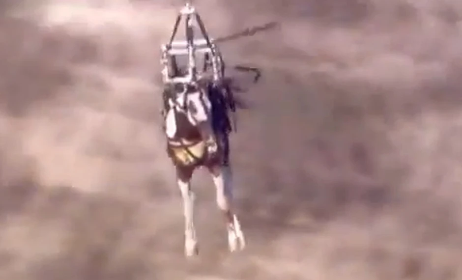 I žena i konj su preživeli, piše “Skaj njuz”. Kako se vidi na snimku objavljenom na “Jutjubu”, konj je podignut 45 metara u vazduh, zakačen pojasevima i užetom za helikopter.