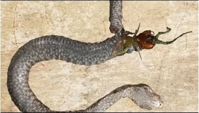 Kada su izvukli stonogu iz zmije shvatili su da je ona velika skoro koliko i zmija.