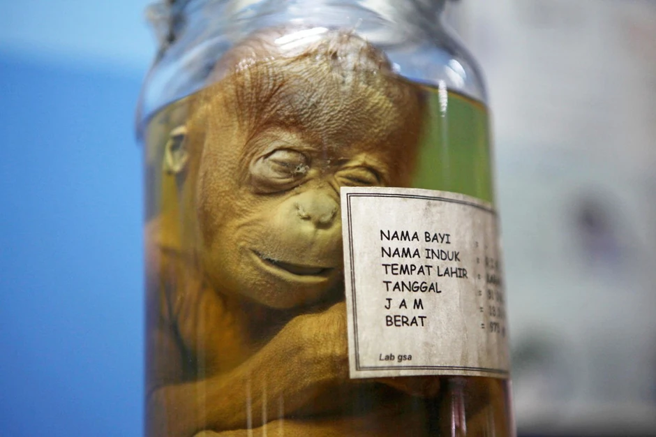 Iako na prvi pogled deluje kao prizor iz horor filmova, ovaj mali orangutan iz tegle zapravo služi za podučavanje ljudi o divljim životinjama.