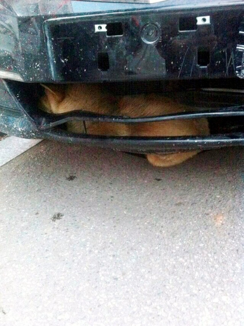 Mladi pas lutalica preživeo je udar automobila, zaglavio se u rešetki branika i prošao sa samo manjim ogrebotinama.