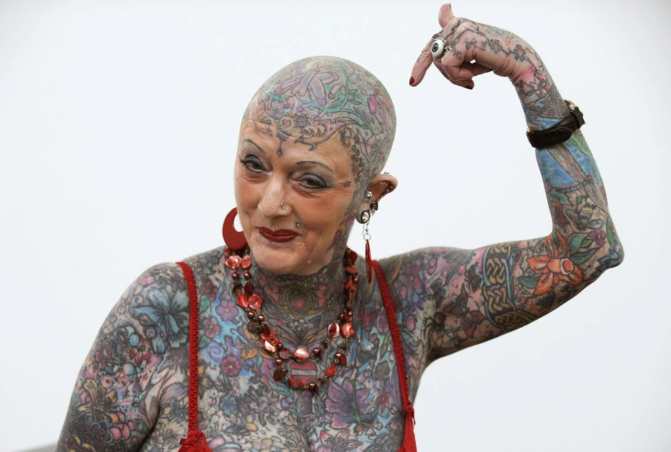 Najbolji test za to predstavlja Izobel Verli, (77), prema Ginisovoj knjizi rekorda “Starija osoba s najviše tetovaža” na svetu. Izobel je počela da se tetovira tek oko četrdesete godine, ali onda više nije mogla da stane, tako da danas praktično nema slobodnih delova kože, osim lica i dlanova.