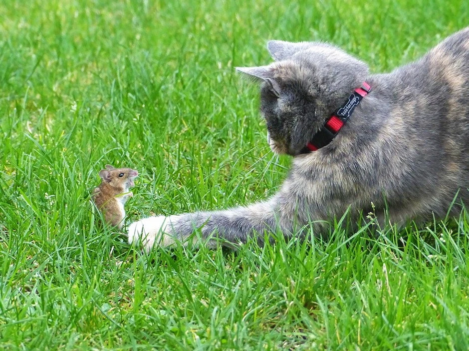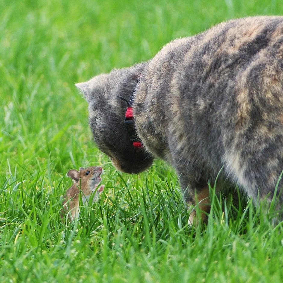 Na ovim fotografijama vidi se tenzija prvog susreta mačke i miša, sekundu pre nego što se miš da u beg. Ovu zanimljivu situaciju uslikala je Enora Leboz u svojoj bašti.