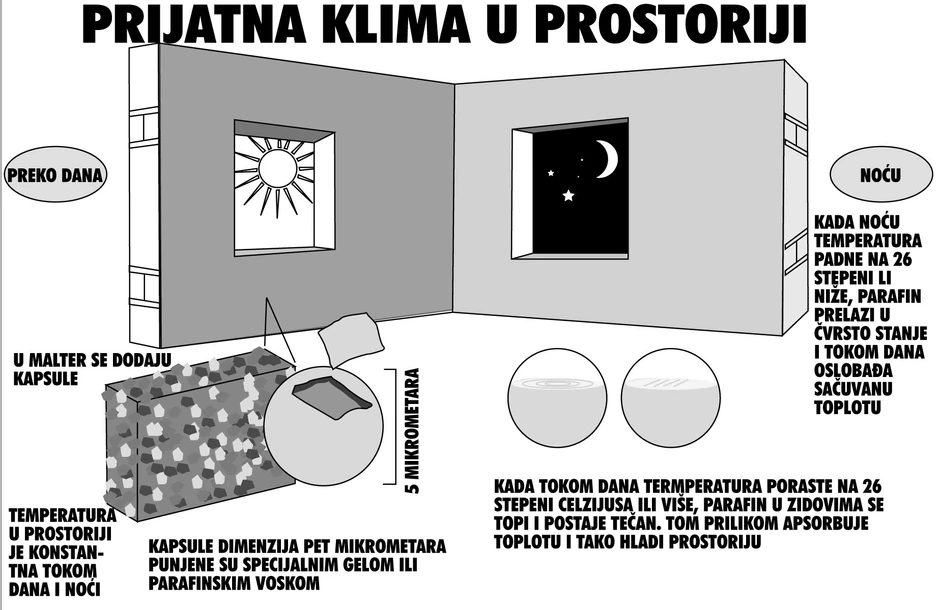 Hemijska kompanija BASF razvila je materijal “Micronal”, koji se topi na temperaturi od 26 stepeni Celzijusa i izvlači toplotu iz prostorije, kako bi je ponovo emitovao tokom noći, kada se vosak u minijaturnim kapsulama ponovo učvrsti (pogledati grafiku).