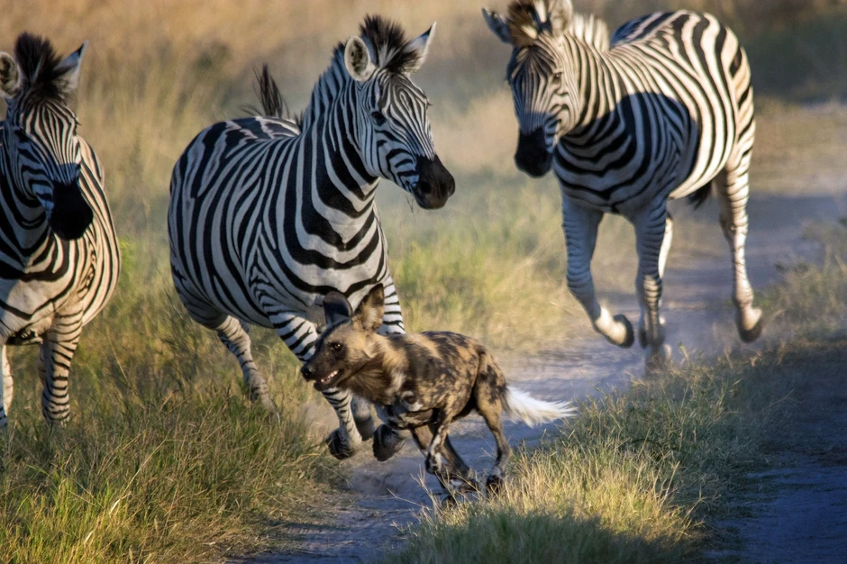 Na delti Okanagve u Bocvani hijene koje su htele da napadnu zebre na kraju su morale da se razbeže da bi spasle živu glavu.