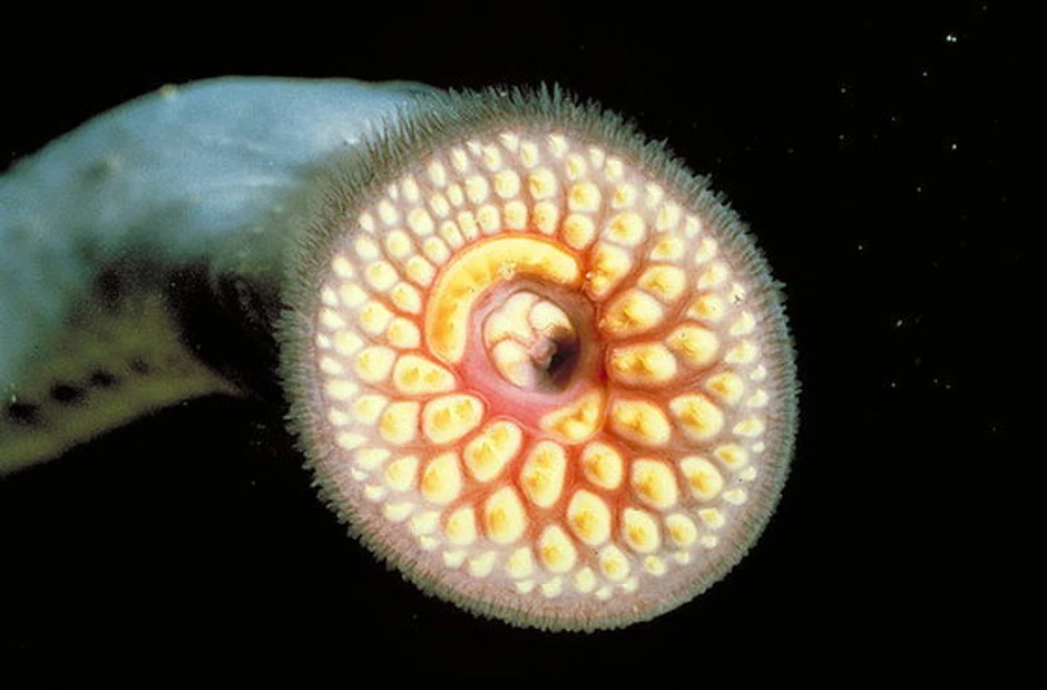 Jedno takvo čudovište je Petromyzon marinus, parazit koji dostiže dužinu od 90 centimetara i sisa krv svojih žrtava riba kako bi preživeo. Kada larva završi metamorfozu u odraslu jedinku, ona dobija usta nalik na sisaljku. Kada se prikači za žrtvu, ona pomoću jezika skida riblju krljušt kako bi neometano mogla da se naslađuje njenom krvlju.